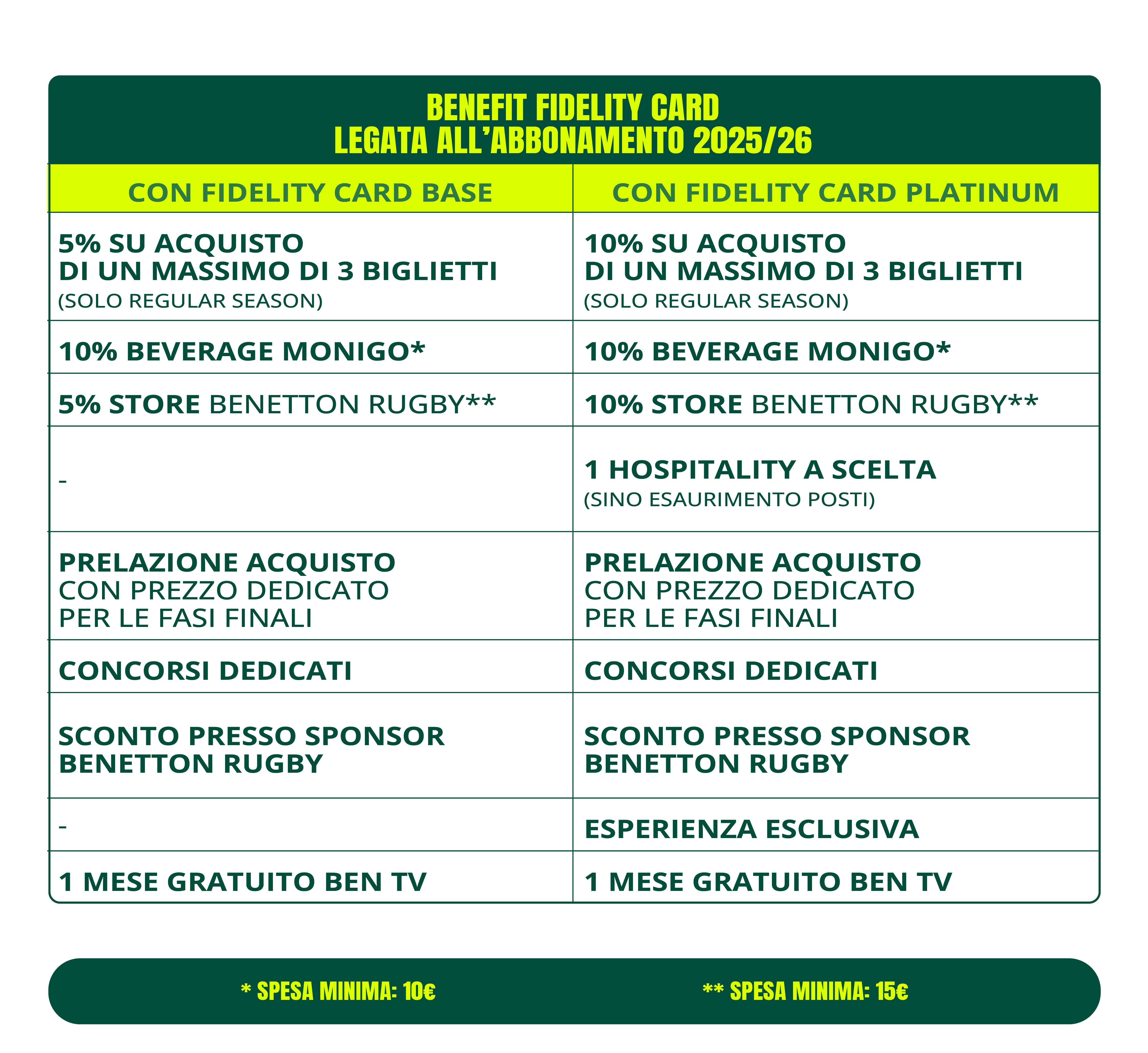 Per la stagione sportiva 2025/26 il Benetton Rugby propone la possibilità di scegliere tra due differenti Fidelity Card: Base o Platinum.